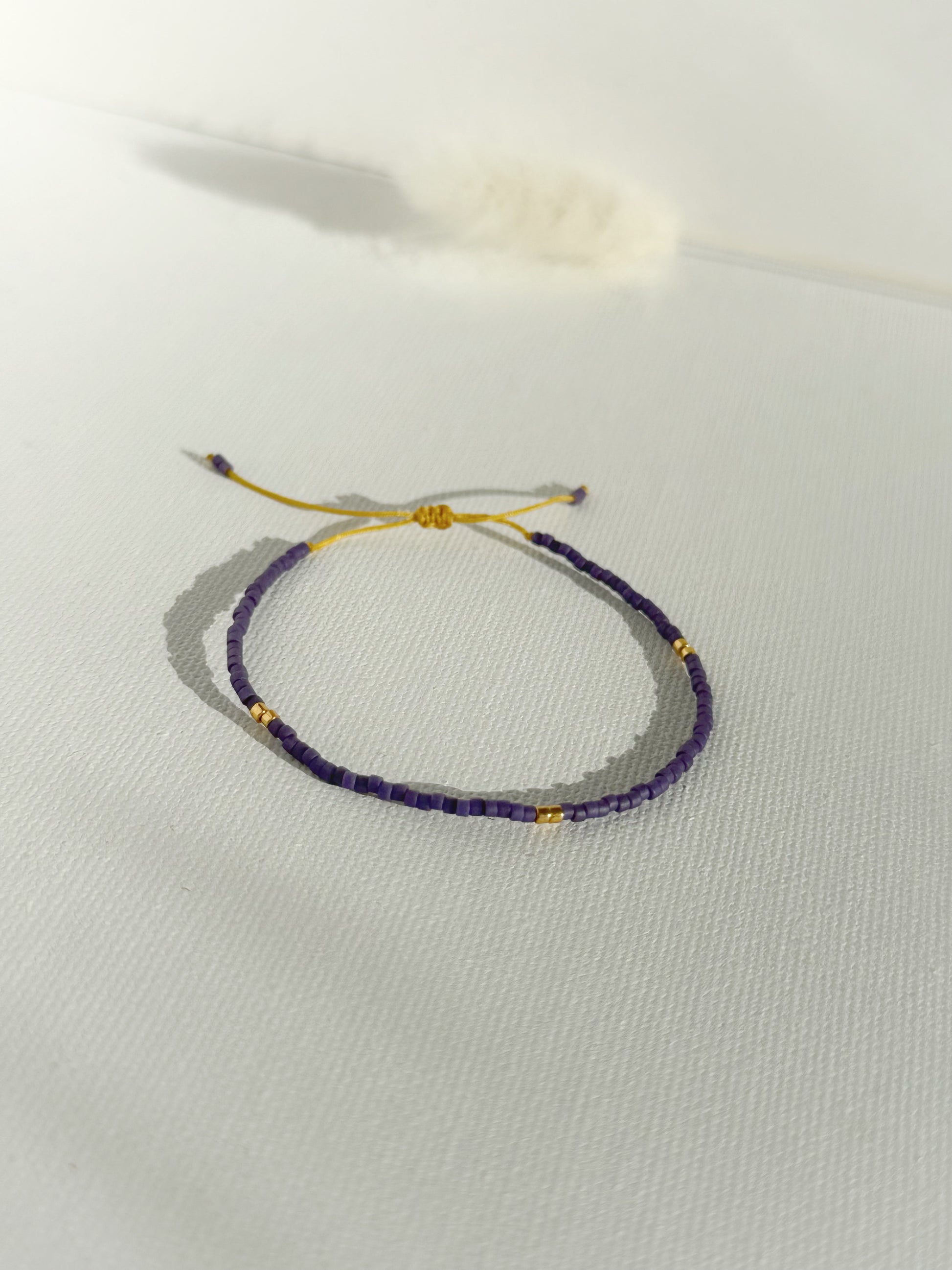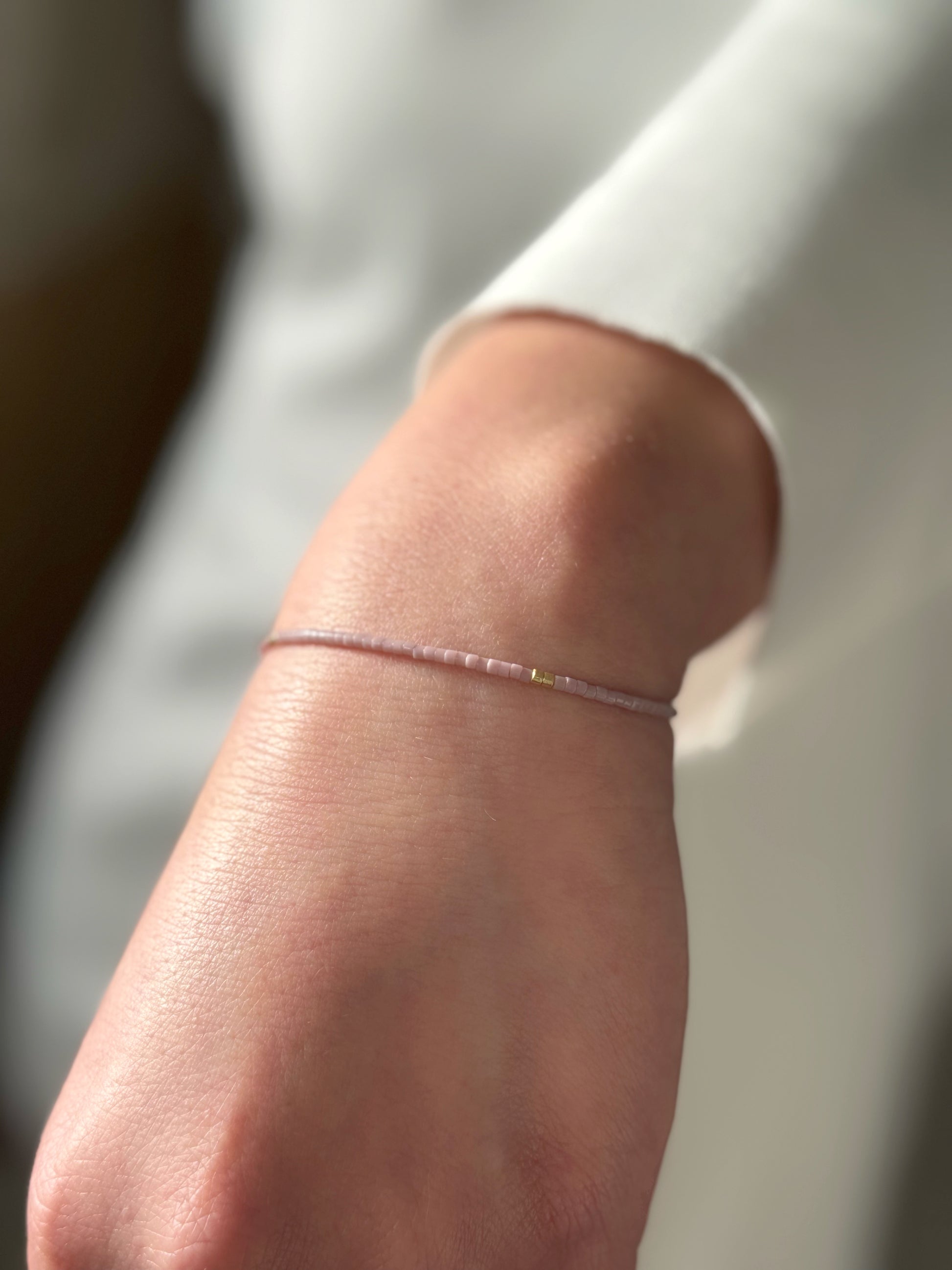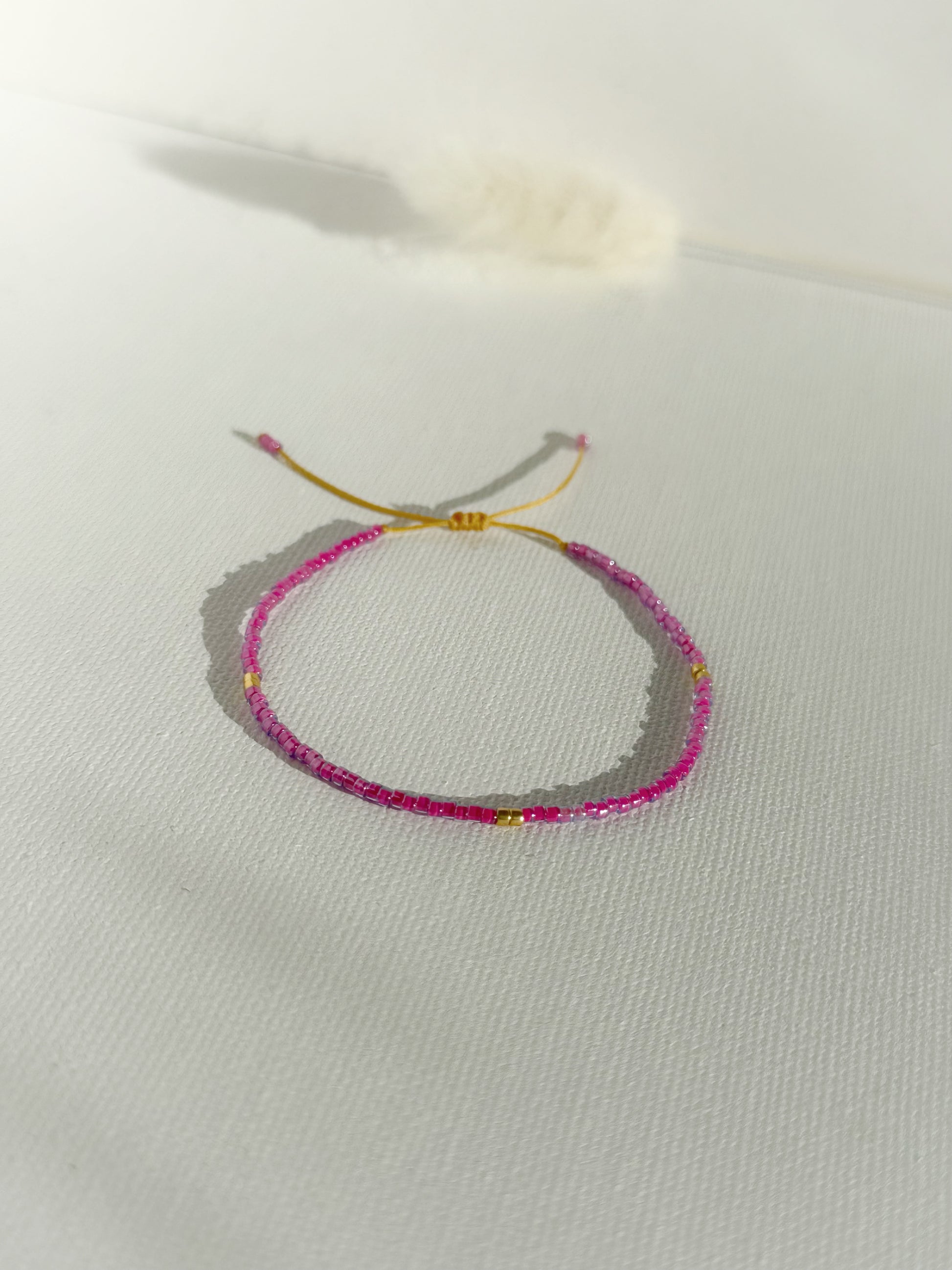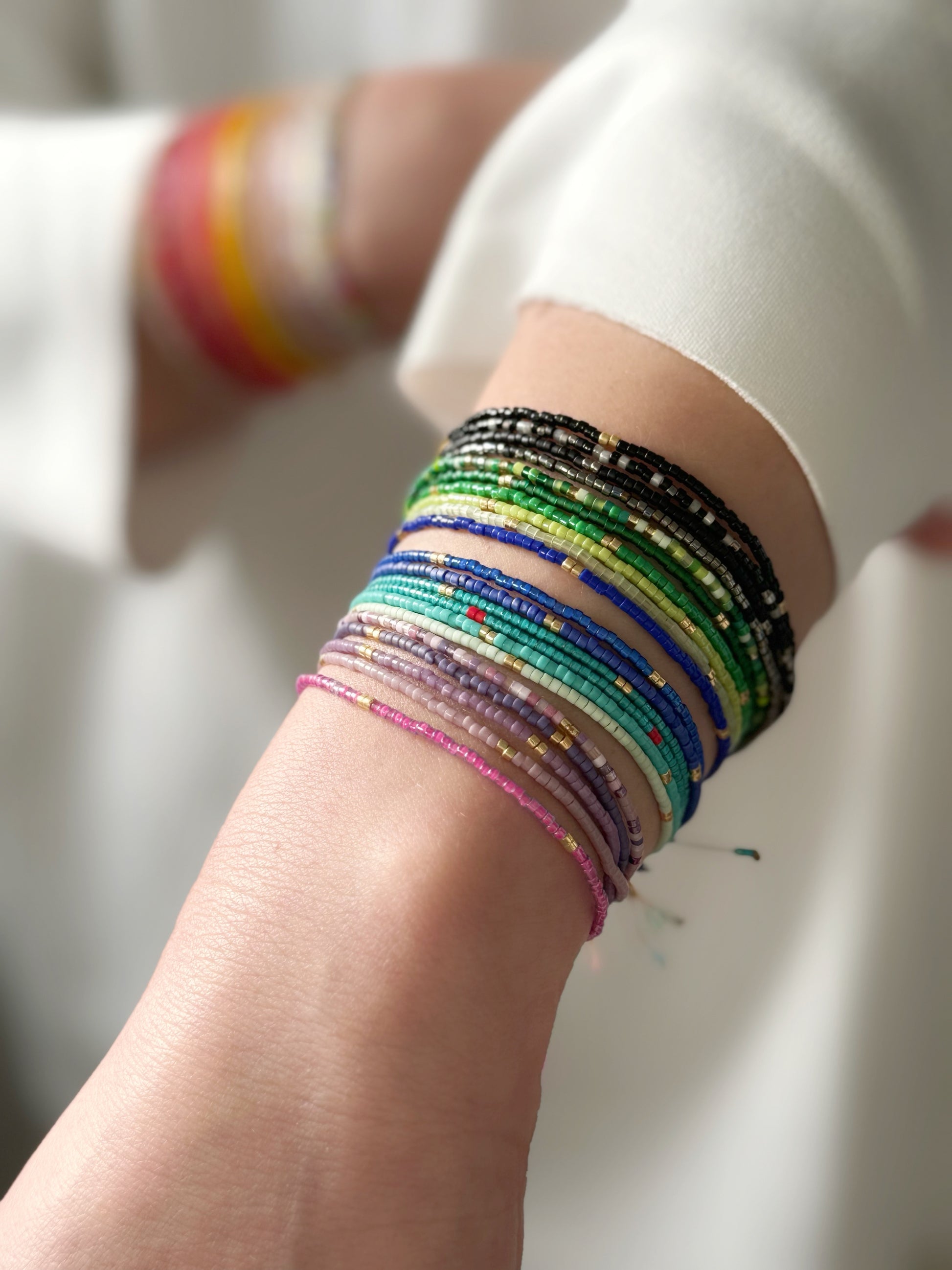 Designed and handcrafted in my Studio in Edinburgh. These bracelets are crafted with Miyuki glass seed beads and delicate gold accents. Finished with a gold nylon cord and adjustable sliding slip knot closure for a perfect fit. Ideal for stacking or wearing alone as a unique statement piece.
